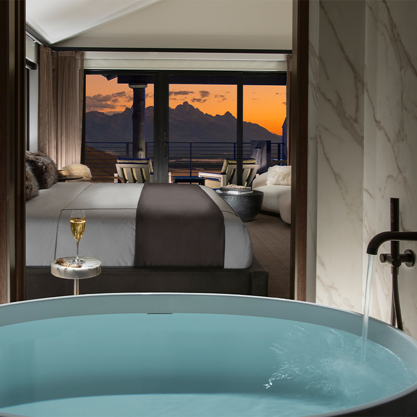 That intention is felt immediately upon entering a suite. Fireplaces anchor each room, while design elements pull from the American Mountain West through a modern lens—AntlerWorx light fixtures, subtle nods to fly fishing and wildlife, and art sourced from celebrated regional photographers. “There are a lot of log-cabin-style properties in the Tetons,” Miller says. “Here, it’s about recognizing our location with a luxurious and refreshed tone.”
