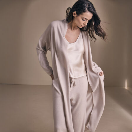 La Vestaglia Sugar di Frette è realizzata in sontuoso cashmere e presenta una cintura in vita e tasche applicate nella parte anteriore. Questa vestaglia è un lusso senza tempo ed è ideale da indossare sopra il Set Jogging Flow.